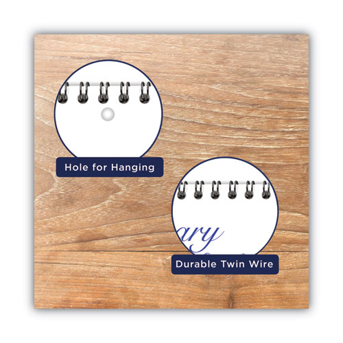 Calendar is wirebound with a center hole punch for easy wall display.