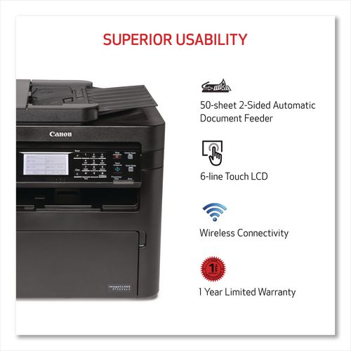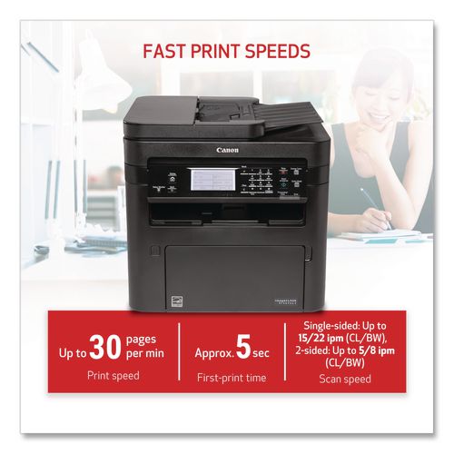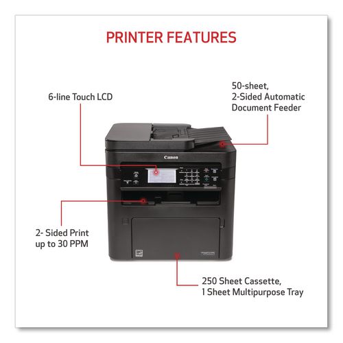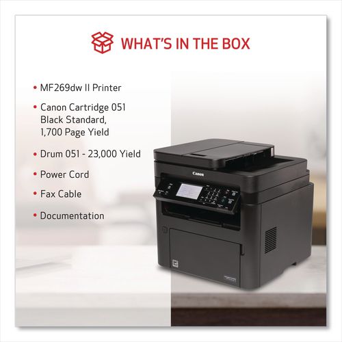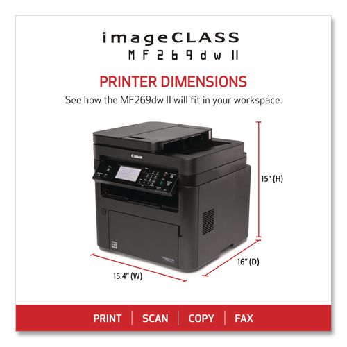 Upgrade your home office with the Canon® imageCLASS MF269dw II wireless black and white all-in-one laser printer, specially designed for small office environments requiring multifunctional capability and productivity. Experience endless possibilities with print, scan, copy, and fax functions, while enjoying swift printing speeds of up to 30 pages per minute. This high-performance 600 dpi printer supports various media types to accommodate your diverse printing needs. Stay connected effortlessly with wireless networking and simplify your printing tasks with mobile capabilities. The high-capacity toner option offers extended efficiency by limiting interruptions due to frequent toner replacements. With compatibility across Windows®, Mac® OS, and Chrome OS, the Canon® imageCLASS MF269dw II is the ultimate solution for enhancing your home office setup.