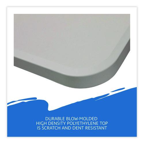 Product Details** Global Product Type Multiuse Folding & Nesting Tables Top Shape Rectangular Color Family Gray Maximum Weight Capacity Supports Up to 250 lb (evenly distributed) Overall Width 60″ Height (Max) 29″ Top Color Platinum Overall Depth 30″ Top Material Blow-Molded High-Density Polyethylene Base/Leg Material 1″ Tubular Steel Base Type (4) Folding Legs Edge Detail Profile Radius Edge For Use With Iceberg Rough ‘N Ready Folding and Stacking Chairs Product Biodegradability in Days 0 Compliance Standards Meets or Exceeds ANSI/BIFMA Standards Pre-Consumer Recycled Content Percent 35% Post-Consumer Recycled Content Percent 0% Total Recycled Content Percent 35% Country Of Origin CN Carton Weight 34 lbs. Carton Pack Quantity 1 EA Pack Quantity 0 UPC 674785654538 UNSPSC 56101706 Shipping Weight & Item Dimensions Weight 34 lbs. Length 32 in Height 6 in Width 32 in Warranty Manufacturer’s limited 15-year warranty.