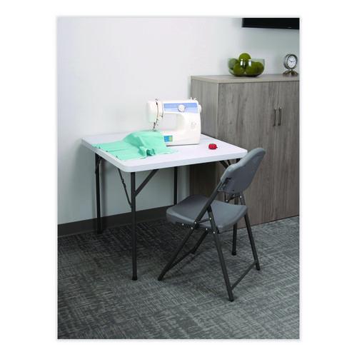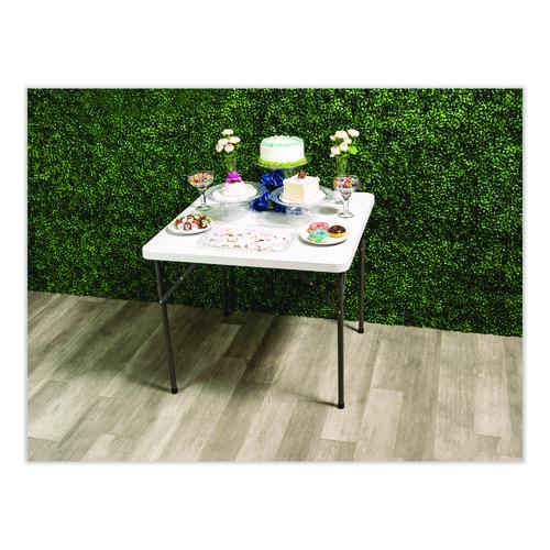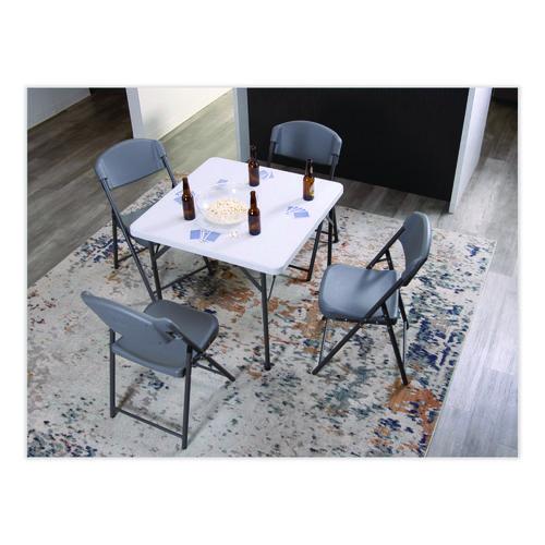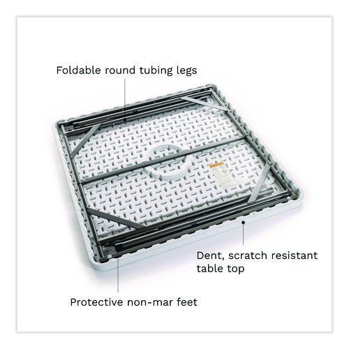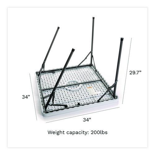 Product Details** Global Product Type Multiuse Folding & Nesting Tables Top Shape Square Color Family Gray Maximum Weight Capacity Supports Up to 200 lb (evenly distributed) Overall Width 34″ Height (Max) 29″ Base Color Powder Coated Gray Top Color Platinum Granite Top Thickness 2″ Overall Depth 34″ Top Material Blow-Molded High-Density Polyethylene Base/Leg Material Powder Coated Steel Base Type (4) Folding Legs Folded Height 2.25″ Edge Detail Profile Radius Edge Caster/Glide/Wheel Foot Cap Product Biodegradability Indicator N Product Biodegradability in Days 0 Product Compostability Indicator N Compliance Standards Meets or Exceeds ANSI/BIFMA Standards Pre-Consumer Recycled Content Percent 0% Post-Consumer Recycled Content Percent 0% Total Recycled Content Percent 0% Country Of Origin CN Carton Weight 21 lbs. Carton Pack Quantity 1 EA Pack Quantity 0 UPC 674785652534 UNSPSC 56101519 Shipping Weight & Item Dimensions Weight 20.9 lbs. Length 49 in Height 2.5 in Width 49 in Warranty Manufacturer’s limited 15-year warranty.