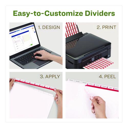 Whether you’re coordinating a single project or multiple binder sets, these dividers let you to get it done quickly and easily, with professional results. The clear labels virtually disappear on the tabs, giving your dividers a clean, printed-on look. Save time with the Easy Apply strip that lets you label all the tabs at once, making it simple to create custom dividers right from your desktop. Just use the free templates from Avery Design & Print and you can personalize and print your Easy Apply tab labels in minutes. These dividers are the professional solution for all your organizational needs. For laser and inkjet printers.