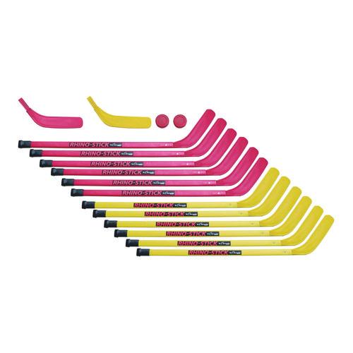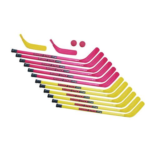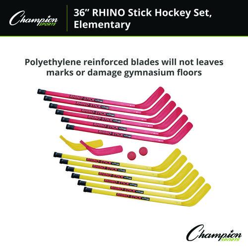 With everything you need to get a group together to play floor hockey, the Champion Sports 36″ Rhino® stick elementary hockey set includes 12 sticks and two no-bounce pucks for indoor use. Designed with ABS plastic shafts, these hockey sticks are exceptionally durable while also being comfortable and lightweight for younger players. The polyethylene reinforced blades will not leave marks or damage gymnasium floors.