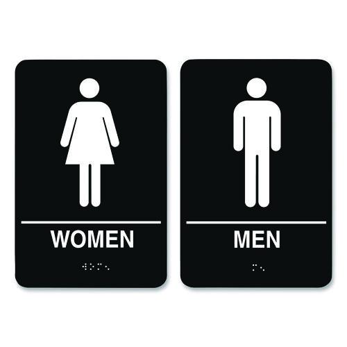 Displays men and women pictograms plus white text and Braille characters. Flexible plastic sign includes adhesive mounting tape.