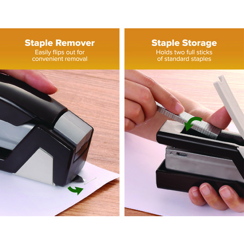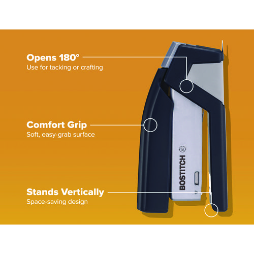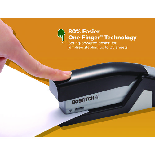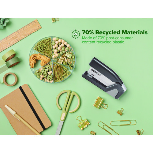 Experience one-finger convenience with our inJoy™ Spring-Powered Stapler. This innovative tool with One-Finger™ Spring-Powered Technology ensures fast, hassle-free stapling that’s 80% easier than standard staplers. Enjoy jam-free performance while securely binding up to 25 sheets. Its compact, lightweight design is perfect for on-the-go use. Plus, it boasts an ergonomic curved design, built-in staple puller and storage, and versatile functionality for bulletin board tacking and crafts. With half strip staple capacity, optimal performance is built to last. Crafted from post-consumer recycled plastic, it’s a sustainable choice for your office setup.