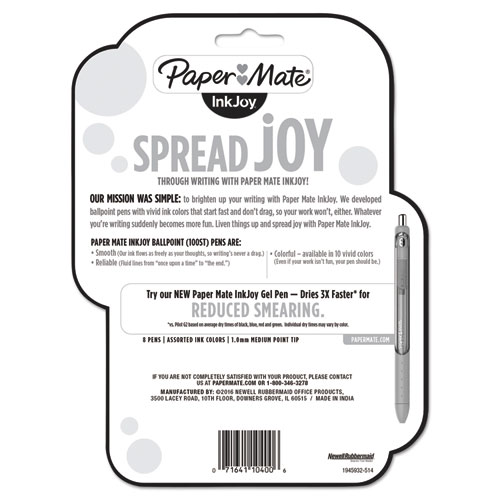 Product Details** Global Product Type Ballpoint Pens Pen Style Stick Pen Tip Type Conical Pen Point Size Type Medium Color Family Multicolor Erasable Ink No Refillable No Pen Sub-Brand & Product Family InkJoy™ 100 Pen Type Ballpoint Pen Pen Point Size 1 mm Pen Ink Color(s) Assorted Pen Ink Color(s) Assortment Black,Blue,Green,Magenta,Orange,Purple,Red,Turquoise Pen Barrel Color(s) Assorted Pen Barrel Color(s) Assortment Translucent Blue,Translucent Gray,Translucent Green,Translucent Magenta,Translucent Orange,Translucent Purple,Translucent Red,Translucent Turquoise Pen Cap Color(s) Assorted Pen Cap Color(s) Assortment Black,Blue,Green,Magenta,Orange,Purple,Red,Turquoise Airplane-Safe Ink Yes Low-Viscosity Ink No Pen Grip Type Smooth Visible Ink Supply Yes Pocket Clip Indicator Yes Product Biodegradability in Days 0 Compliance Standards Box Tops for Education Pre-Consumer Recycled Content Percent 0% Post-Consumer Recycled Content Percent 0% Total Recycled Content Percent 0% Country Of Origin IN Carton Weight 3 lbs. Carton Pack Quantity 12 ST Pack Quantity 8 EA UPC 071641104006 UNSPSC 44121704 Shipping Weight & Item Dimensions Weight 0.185 lbs. Length 7.63 in Height 0.63 in Width 6.75 in