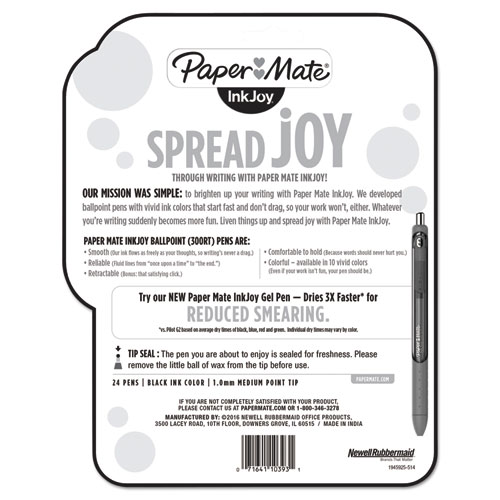 Product Details** Global Product Type Ballpoint Pens Pen Style Retractable Pen Tip Type Conical Pen Point Size Type Medium Color Family Black Erasable Ink No Refillable Yes Pen Sub-Brand & Product Family InkJoy™ 300 RT Pen Type Ballpoint Pen Pen Point Size 1 mm Pen Ink Color(s) Black Pen Barrel Color(s) Black Airplane-Safe Ink Yes Low-Viscosity Ink No Special Ink Properties Advanced Ink Pen Grip Type Extended Rubber Visible Ink Supply No Pocket Clip Indicator Yes Product Biodegradability in Days 0 Compliance Standards Box Tops for Education Pre-Consumer Recycled Content Percent 0% Post-Consumer Recycled Content Percent 0% Total Recycled Content Percent 0% Country Of Origin IN Carton Weight 24 lbs. Carton Pack Quantity 36 PK Pack Quantity 24 EA UPC 071641103931 UNSPSC 44121704 Shipping Weight & Item Dimensions Weight 0.54 lbs. Length 9.38 in Height 1.25 in Width 7.12 in