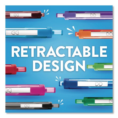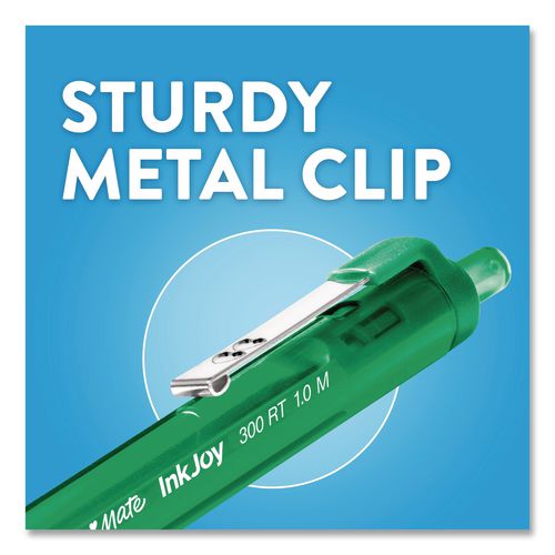 Product Details** Global Product Type Ballpoint Pens Pen Style Retractable Pen Tip Type Conical Pen Point Size Type Medium Color Family Multicolor Erasable Ink No Refillable Yes Pen Sub-Brand & Product Family InkJoy™ 300 RT Pen Type Ballpoint Pen Pen Point Size 1 mm Pen Ink Color(s) Assorted Pen Ink Color(s) Assortment (3) Black,(3) Blue,(2) Red Pen Barrel Color(s) Assorted Pen Barrel Color(s) Assortment (3) Black,(3) Blue,(2) Red Pen Cap Color(s) Assorted Pen Cap Color(s) Assortment (3) Black,(3) Blue,(2) Red Permanent/Washable Ink Washable Archival-Quality Ink No Airplane-Safe Ink Yes Low-Viscosity Ink No Special Ink Properties Advanced Ink Pen Grip Type Extended Rubber Visible Ink Supply Yes Pocket Clip Indicator Yes Product Biodegradability Indicator N Product Biodegradability in Days 0 Product Compostability Indicator N Pre-Consumer Recycled Content Percent 0% Post-Consumer Recycled Content Percent 0% Total Recycled Content Percent 0% Country Of Origin IN Carton Weight 8 lbs. Carton Pack Quantity 36 PK Pack Quantity 8 EA UPC 071641103863 UNSPSC 44121704 Shipping Weight & Item Dimensions Weight 0.2 lbs. Length 5.75 in Height 7.62 in Width 0.62 in