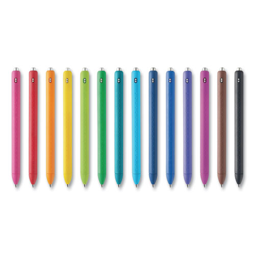 Product Details** Global Product Type Gel Pens Pen Style Retractable Pen Tip Type Conical Pen Point Size Type Fine Color Family Multicolor Erasable Ink No Refillable No Pen Sub-Brand & Product Family InkJoy Pen Type Gel Pen Pen Point Size 0.5 mm Pen Ink Color(s) Assorted Pen Ink Color(s) Assortment Berry,Black,Bright Blue,Cocoa,Green,Lime,Orange,Pink,Pure Blue,Purple,Red,Slate Blue,Teal,Yellow Pen Barrel Color(s) Assorted Pen Barrel Color(s) Assortment Berry,Black,Bright Blue,Cocoa,Green,Lime,Orange,Pink,Pure Blue,Purple,Red,Slate Blue,Teal,Yellow Low-Viscosity Ink Yes Special Ink Properties Water-Based Gel Pen Grip Type Comfort Visible Ink Supply Yes Pocket Clip Indicator Yes Product Biodegradability in Days 0 Compliance Standards Box Tops for Education Pre-Consumer Recycled Content Percent 0% Post-Consumer Recycled Content Percent 0% Total Recycled Content Percent 0% Country Of Origin KR Carton Weight 5 lbs. Carton Pack Quantity 12 PK Pack Quantity 14 EA UPC 071641120808 UNSPSC 60121524 Shipping Weight & Item Dimensions Weight 0.44 lbs. Length 7.66 in Height 0.688 in Width 7.492 in