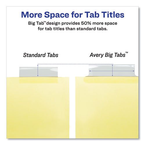 Big Tab dividers are bigger providing 50% more writing space than standard tabs. Special tab design allows easy insertion and removal, but keeps insert securely in place. Reinforced binding edge. White or buff paper dividers with clear or multicolor insertable tabs. It’s easy to customize inserts using free templates from Avery Design & Print. Three-hole punched for use in standard ring binders, mini size 5.5 x 8.5 dividers are seven-hole punched for small binders and organizers, and legal size are 4-hole punched for legal size binders. Handwrite or print inserts on laser and inkjet printers.