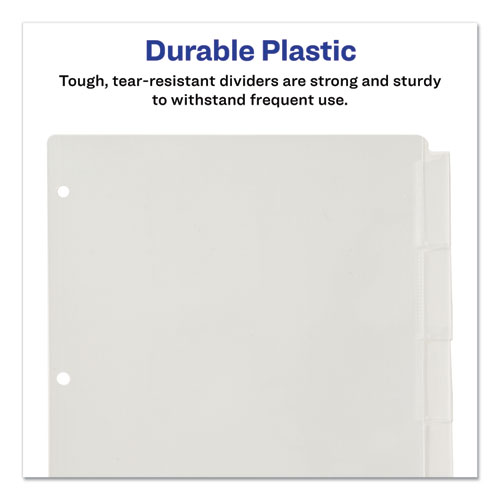 Sometimes good things do come in big packages. Big Tab™ Insertable Plastic Dividers offer extra convenience for your binder or notebook. The larger style insertable tabs accommodate inserts that you can print with sizeable fonts or more lines of text than on a typical insert for even more eye-catching power. Use free templates from Avery Design & Print to create professional-looking tabs. An easy-access notch at the top of the tab lets you slide inserts in and out with ease, while a secure indent point at the base of the tab keeps your insert from falling out. Translucent plastic offers a durable solution, so you can enjoy long-lasting organization of all your big ideas. Handwrite or print inserts on laser and inkjet printers.