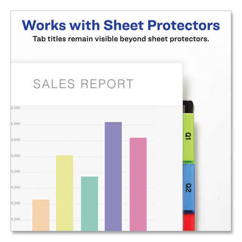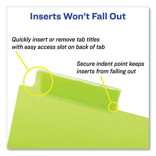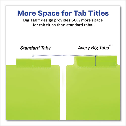 Keep papers safe and secure with these Insertable Plastic Dividers. They offer storage space along with extra large tabs in eye-catching colors for quick, easy reference. Each divider features three pockets constructed in durable plastic to accommodate loose papers up to 8 1/2″ x 11″ without folding or punching. The unique Corner Lock® tab helps keep your papers in place. Big Tab™ multicolored dividers have tabs that are bigger, providing 50% more writing space than standard tabs. Three-hole punched and ready-to-use. Now that’s a big idea. Handwrite or print inserts on laser and inkjet printers.
