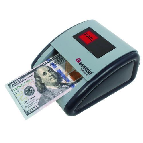 Instantly check a bill’s authenticity with the Cassida InstaCheck automatic counterfeit detector. The InstaCheck uses advanced infrared sensors and a comprehensive database of mapped infrared, magnetic and ultraviolet bill markings to verify if cash is legitimate or counterfeit. Verifying the infrared security markings on a bill is a highly reliable anti-counterfeit protection available in paper currency, far more reliable than trying to check for watermarks with a pen or UV light. This compact counterfeit detector has a simple Pass/Fail interface that provides clear, quick feedback on a bill’s authenticity. Simply insert the currency in question into the InstaCheck in the direction illustrated on the machine (face up, facing outward). The InstaCheck will handle the rest! Cassida’s U.S.-based support team is ready to help. If you count on cash for your business, count on one of America’s trusted brands in business-grade currency counterfeit detector handling solutions: Cassida..