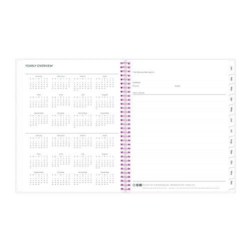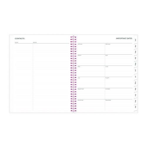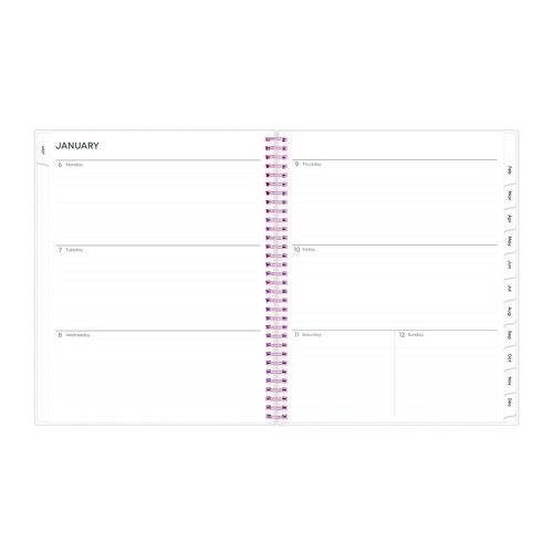 Product Details** Global Product Type Appointment Book/Personal Organizers Dated Yes Academic Year No Calendar Format Weekly/Monthly Edition Year 2025 Calendar Term 12-Month (Jan to Dec) Binding Type Wire-O Color Family Multicolor Refillable No Calendar Spread Format One Week per Two-Page Spread,One Month per Page Julian Dates Yes Size (Bound-Side First) 11 x 8.5 Binding Details Twin-Wire Cover Theme Floral Artwork Cover Color(s) Pink/Peach/Black Cover Material(s) Polypropylene Binding Color(s) Rose Gold Appointment Ruling Open Scheduling Calendar Reference Blocks One Past Month,One Future Month Separate Sections (6) Bonus Past Monthly Spreads (July-Dec),Holidays/Important Dates,Notes/Memos,Contacts Page,Two-Year Reference Calendar,Yearly Goals Sheets per Calendar/Planner 70 Sheet Color(s) White Pocket Details (1) Two-Sided Interior Storage Pocket Reversible No Seasonal Availability Yes Product Biodegradability Indicator N Product Biodegradability in Days 0 Product Compostability Indicator N Pre-Consumer Recycled Content Percent 0% Post-Consumer Recycled Content Percent 0% Total Recycled Content Percent 0% Disclaimer Statement This product was made using wood sourced from a certified managed forest. Country Of Origin CN Carton Weight 6 lbs. Carton Pack Quantity 6 EA Pack Quantity 0 UPC 699931914687 UNSPSC 44112004 Shipping Weight & Item Dimensions Weight 1 lbs. Length 9.25 in Height 11.125 in Width 0.625 in