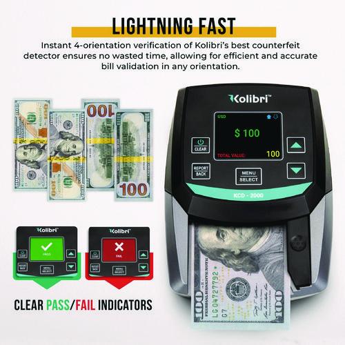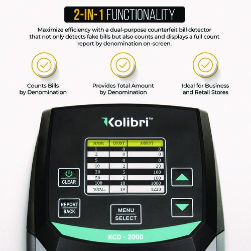 Protect your business from counterfeit money with the KCD-2000 2-in-1 Counterfeit Money Detector. The KCD-2000 makes use of a multitude of detection methods to ensure the cash your business receives from customers Is authentic. Far more effective than a simple pen or UV lamp, featuring systems that check the bill for ultraviolet, magnetic ink, infrared and size security features to ensure it is authentic U.S. currency. In addition to powerful counterfeit detection capabilities, the KCD-2000 offers simple user-friendly operation. It can verify bills in all four orientations to save time and eliminate the frustration of false rejects due to an incorrect orientation insertion. The large and clear TFT display with the intuitive control panel make this money detector the perfect product for efficient cash counting and counterfeit detection. In addition to counterfeit detection, the KCD-2000 also counts the number and the value of bills that have been scanned and displays the full count by denomination on a specific on-screen report. This compact counterfeit detector fits easily in any point of sale environment. For fast, easy defense against counterfeit money, add the KCD-2000 to your business.