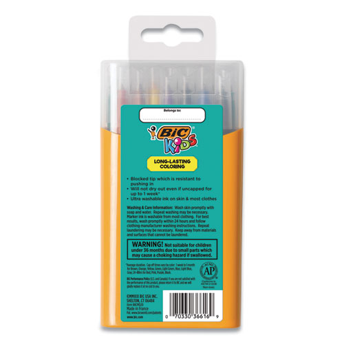 Product Details** Global Product Type Art Markers Marker Ink Type Washable Marker Grade General Use Marker Tip Type Bullet Color Family Multicolor Marker Tip Size (text) Medium Marker Color(s) Assorted Marker Color Assortment Atlantic Blue,Black,Blue,Cardinal Violet,Dark Brown,Gray,Green,Light Blue,Light Pink,Lime Green,Orange,Peach,Pink,Purple,Red,Sky Blue,Water Green,Yellow,Yellow Green,Yellow Orange Marker Series Kids® Ultra Washable Product Biodegradability Indicator N Product Biodegradability in Days 0 Product Compostability Indicator N Pre-Consumer Recycled Content Percent 0% Post-Consumer Recycled Content Percent 0% Total Recycled Content Percent 0% Disclaimer Statement Average cap-off dry-out times vary by color: seven to 30 days for Blue, Brown, Gray, Green, Light Blue, Light Green, Orange and Yellow,24 to 48 hours for Black, Pink, Purple and Red. Special Features Reusable Plastic Tube—Markers are packaged in a durable reusable plastic tube to help keep markers together with frequent use. Country Of Origin FR Carton Weight 3 lbs. Carton Pack Quantity 6 PK Pack Quantity 20 EA UPC 070330366169 UNSPSC 44121708 Shipping Weight & Item Dimensions Weight 0.5 lbs. Length 6.7 in Height 1.3 in Width 3.1 in