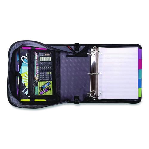 Perfect for organizing all of your classroom essentials. Inside is a 5-tab, 6-pocket expanding file folder to keep all of your important papers secure and organized. You will also find an interior zippered mesh pocket which is perfect storage for your pens and pencils. Large exterior zippered compartment allows you to store other personal items. Patented angled zipper keeps the gusset out of the way when writing. Comes with a handle and shoulder strap enabling ease of transporting materials. Binder gusset is made of Ripstop material, which prevents tearing. Binder is constructed of sturdy Kraft Board–strong enough to last the school year and prevents warping. Unique organizational tools for school or home use.