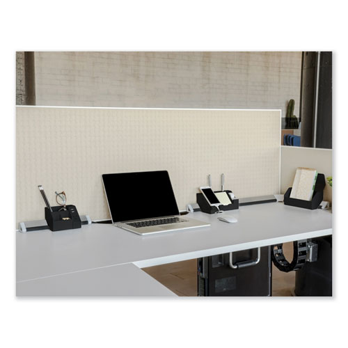 Get ready to do some major office organization with this 12-piece connect desktop organizer and cable management kit. Coming with three cord management rails that hide wires and dock accessories, this kit also includes a short and a wide storage bin. Holding pens, tacks, staples and more, they each come with dividers and lids to conceal messy clutter. The tape dispenser is slim and comes with office tape so you’re ready to work. The sticky note holder displays and keeps business cards and post-its nearby. You also get a 3″ x 3″ pad of yellow sticky notes. Charge up with the power hub. It features one single outlet and two USB ports. The phone dock also features a USB charging port and safely docks your phone for easy viewing and use. The Konnect office supply organizer solves workspace clutter by docking all essentials in a single, stable location. Features connector essentials rails that route/hide cable and docks accessories. Kit, stores pencils, tacks, business cards, sticky notes, tape and more. Phone dock and power hub charges various devices. Includes all accessories for various mounting.