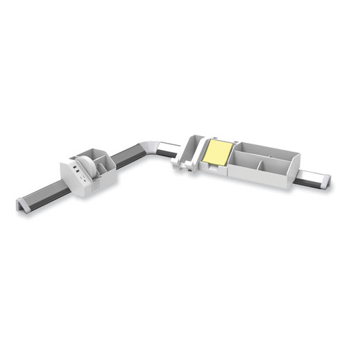 Get ready to do some major office organization with this 12-piece connect desktop organizer and cable management kit. Coming with three cord management rails that hide wires and dock accessories, this kit also includes a short and a wide storage bin. Holding pens, tacks, staples and more, they each come with dividers and lids to conceal messy clutter. The tape dispenser is slim and comes with office tape so you’re ready to work. The sticky note holder displays and keeps business cards and post-its nearby. You also get a 3″ x 3″ pad of yellow sticky notes. Charge up with the power hub. It features one single outlet and two USB ports. The phone dock also features a USB charging port and safely docks your phone for easy viewing and use. The Konnect office supply organizer solves workspace clutter by docking all essentials in a single, stable location. Features connector essentials rails that route/hide cable and docks accessories. Kit, stores pencils, tacks, business cards, sticky notes, tape and more. Phone dock and power hub charges various devices. Includes all accessories for various mounting.