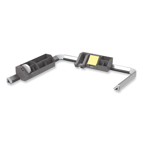 Jam-packed with all office organization essentials, this 14-piece Konnect desk organizer set transforms your office from no thanks to yes please! Dock any connected accessories to the three cord management rails, along with hiding pesky wires that no one wants to look at. The note/business card holder displays sticky notes for unique organization and comes with a yellow pad of sticky notes. The tape dispenser is an office must. It comes with a single roll of tape so you’re off to a steady start. Have a lot of knick-knacks that need to be tucked away somewhere? The one long and two short storage bins do just that. They hold anything from highlighters to extra staples. They even come with modular dividers and removable lids! The power hub allows for easy charging of any device as it includes a power outlet and two USB charging ports. The phone dock safely houses your phone and also features a USB port. Part of the beauty of the Konnect office organizer is you can dock any of your devices right onto the rail or use them independently. Accessories for mounting options included. Features connector essentials rails that route/hide cables and dock accessories, storage for pencils, tacks, business cards, sticky notes, tape and more, phone dock and power hub that charges various devices.