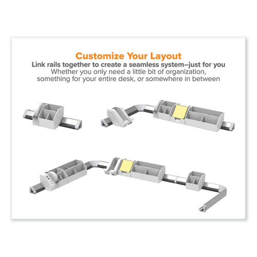 Product Details** Global Product Type Multipurpose Desktop Supplies Organizers Number of Compartments 6 Material(s) Metal,Plastic Color(s) White Desktop Supplies Organizer Type Multipurpose Overall Width 4.02″ Overall Depth 23.54″ Overall Height 5.71″ Desk Accessory Features Phone Dock: 3″w x 3.5″d x 5″h,Short Storage Bin: 3.4″w x 3.5″d x 3.5″h,Sticky Note Holder: 3.9″w x 3.5″d x 3.5″h,Tape Dispenser: 1″w x 3.5″d x 3.5″h Product Biodegradability Indicator N Product Biodegradability in Days 0 Product Compostability Indicator N Package Includes (1) 12″ Cord Management Rail,(1) 21.5″ Cord Management Rail,(1) Corner Connector,(1) Short Storage Bin,(1) Wide Storage Bin,(1) Tape Dispenser,(1) 0.75″ Office Tape Roll,(1) Sticky Note Holder,(1) USB Phone Dock,Mounting Hardware Pre-Consumer Recycled Content Percent 0% Post-Consumer Recycled Content Percent 0% Total Recycled Content Percent 0% Country Of Origin CN Carton Weight 33 lbs. Carton Pack Quantity 8 EA Pack Quantity 0 UPC 842048032021 UNSPSC 44111503 Shipping Weight & Item Dimensions Weight 3.47 lbs. Length 23.54 in Height 4.02 in Width 5.71 in Warranty Manufacturer’s limited three-year warranty.