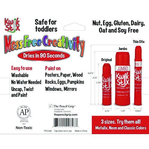Product Details** Global Product Type Paint Sticks Color Family Multicolor Size Group 2X-Large Colored Material Type Solid Tempera Paint Age Recommendation Ages 18 Months and Up Crayon Size 1.5″ x 4.5″ Color(s) Assorted Color Assortment Black,Blue,Brown,Green,Red,Yellow Temp. Range 0° F to 120° F Applicable Material Canvas,Cardboard,Eggs,Glass,Paper,Posters,Wood Length 4.5″ Width 1.5″ Product Biodegradability Indicator N Product Biodegradability in Days 0 Product Compostability Indicator N Pre-Consumer Recycled Content Percent 0% Post-Consumer Recycled Content Percent 0% Total Recycled Content Percent 0% Special Features Classic Country Of Origin CN Carton Weight 13 lbs. Carton Pack Quantity 12 PK Pack Quantity 0 UPC 634901006467 UNSPSC 44121709 Shipping Weight & Item Dimensions Weight 13 lbs. Length 18 in Height 7 in Width 9 in