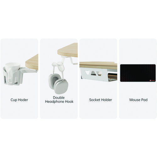• Includes cup holder, headphone hook, cable management tray, and cloth mouse pad.