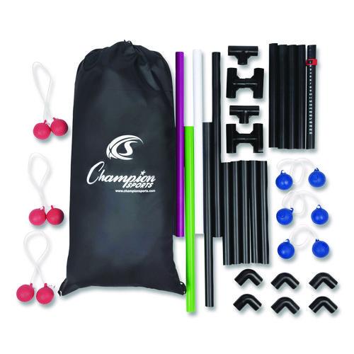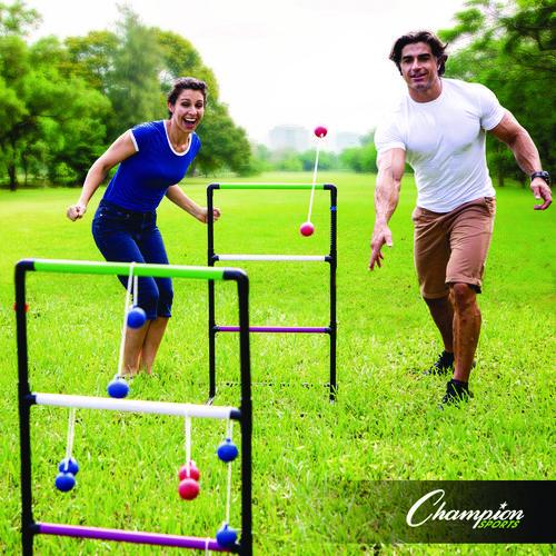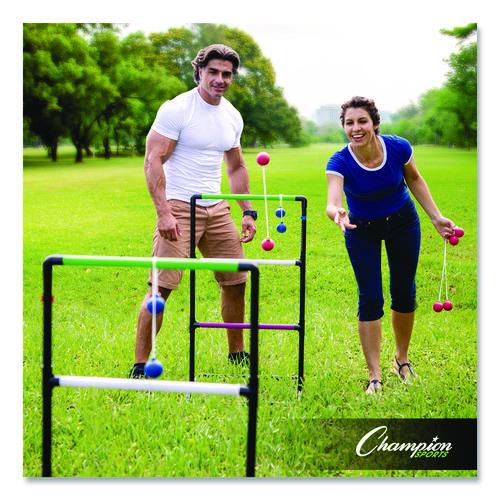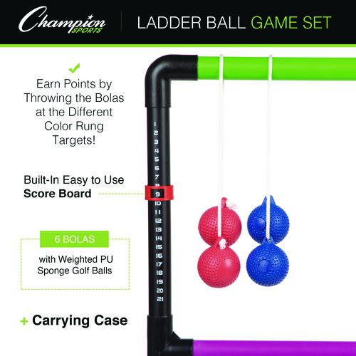 The Champion Sports Ladder Golf Set only takes minutes to set up and provides hours of fun at the beach, park, or your own backyard. *This set includes two plastic ladders with a deep base for stability, and six bolas (two weighted sponge golf balls connected by a string). Earn points by throwing the bolas at the different color rung targets!