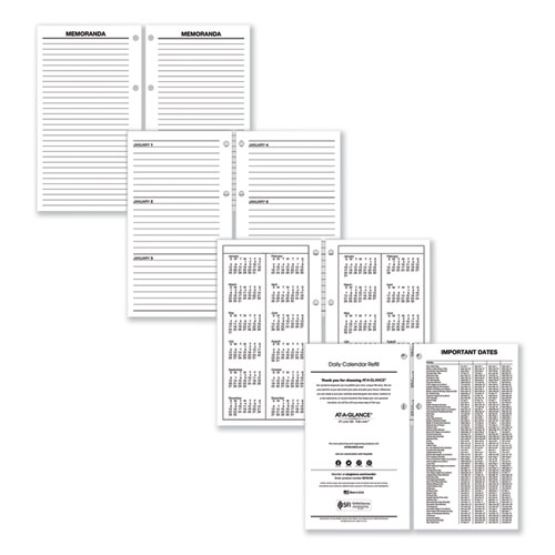 Loose-leaf pages are punched to fit two-ring E21-style calendar bases.