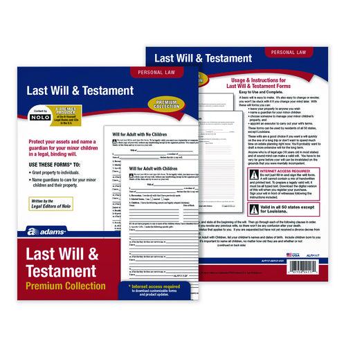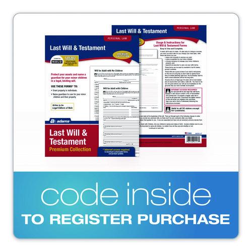 Protect your loved ones and make your wishes known. Reviewed and approved by attorneys and industry experts, Last Will & Testament forms from Adams® Personal Legal collection allow you to name your beneficiaries and distribute your assets, and when relevant, name a guardian for your dependent children, create a children’s trust and name an executer. In addition to a hardcopy sample for rough drafts, this package includes simple, step-by-step instructions and a digital download of a customizable, printable will. Simply register the product with Adams® using the included authorization code and receive your download. Developed with NOLO, the premium provider of DIY legal books and resources. Legally valid in all 50 states.
