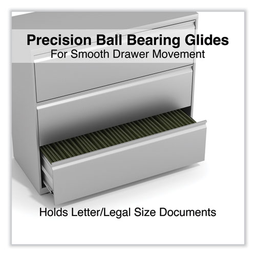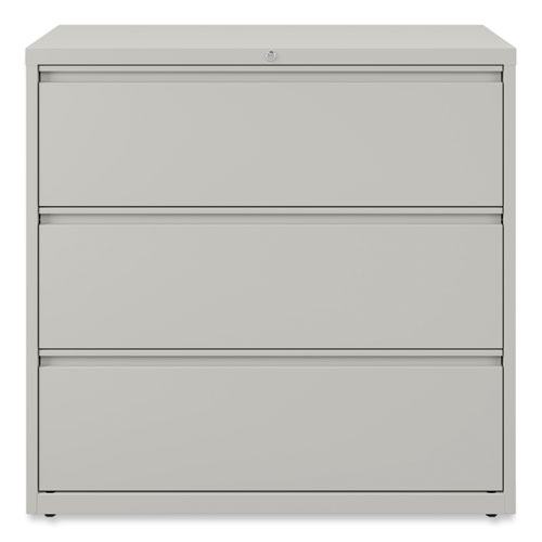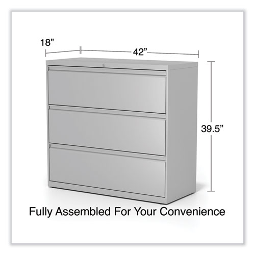 Product Details** Global Product Type Lateral File Cabinets Number of Drawers 3 Drawer Configuration File Anti-Tip Mechanism Indicator Yes Color Family Gray Pedestal Sub-Type Indicator No Caster Indicator No Anti-Tip Mechanism Counterweight,Interlocking Drawers Color(s) Light Gray Overall Width 42″ Overall Depth 18.63″ Overall Height 40.25″ Base Material Metal Top Material Metal Glide/Feet Indicator Yes Glide/Feet Details Four Fixed-Height Glides Document Size Accommodation Legal,Letter,A4,A5 Series Name Alera® Lateral Series Product Biodegradability Indicator N Product Biodegradability in Days 0 Product Compostability Indicator N Compliance Standards Level 2 Certified,Meets or Exceeds ANSI/BIFMA Standards,Meets or Exceeds ISTA Performance Standards,SCS Indoor Advantage Certified,SCS Indoor Advantage Gold Certified Pre-Consumer Recycled Content Percent 12% Post-Consumer Recycled Content Percent 24% Total Recycled Content Percent 36% Special Features Three Drawers Country Of Origin US Carton Weight 174 lbs. Carton Pack Quantity 1 EA Pack Quantity 0 UPC 042167001230 UNSPSC 44111515 Shipping Weight & Item Dimensions Weight 174 lbs. Length 44.5 in Height 42.5 in Width 21.125 in Warranty Manufacturer’s limited five-year warranty.