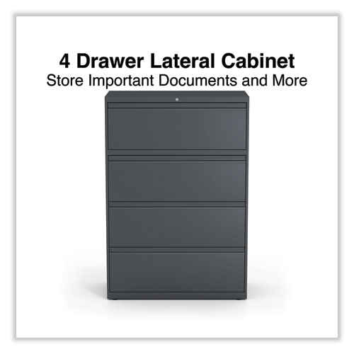 Product Details** Global Product Type Lateral File Cabinets Number of Drawers 4 Drawer Configuration File Anti-Tip Mechanism Indicator Yes Color Family Gray Pedestal Sub-Type Indicator No Caster Indicator No Anti-Tip Mechanism Counterweight,Interlocking Drawers Color(s) Charcoal Overall Width 36″ Overall Depth 18.63″ Overall Height 52.5″ Base Material Metal Top Material Metal Glide/Feet Indicator Yes Glide/Feet Details Four Fixed-Height Glides Document Size Accommodation Legal,Letter,A4,A5 Series Name Alera® Lateral Series Product Biodegradability Indicator N Product Biodegradability in Days 0 Product Compostability Indicator N Compliance Standards Level 2 Certified,Meets or Exceeds ANSI/BIFMA Standards,Meets or Exceeds ISTA Performance Standards,SCS Indoor Advantage Certified,SCS Indoor Advantage Gold Certified Pre-Consumer Recycled Content Percent 12% Post-Consumer Recycled Content Percent 24% Total Recycled Content Percent 36% Special Features Four Drawers Country Of Origin US Carton Weight 175 lbs. Carton Pack Quantity 1 EA Pack Quantity 0 UPC 042167001100 UNSPSC 44111515 Shipping Weight & Item Dimensions Weight 175 lbs. Length 38.5 in Height 54.75 in Width 21.125 in Warranty Manufacturer’s limited five-year warranty.