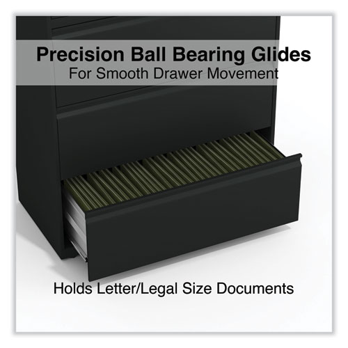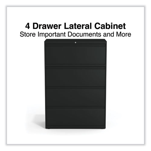 Product Details** Global Product Type Lateral File Cabinets Number of Drawers 4 Drawer Configuration File Anti-Tip Mechanism Indicator Yes Color Family Black Pedestal Sub-Type Indicator No Caster Indicator No Anti-Tip Mechanism Counterweight,Interlocking Drawers Color(s) Black Overall Width 36″ Overall Depth 18.63″ Overall Height 52.5″ Base Material Steel Top Material Steel Glide/Feet Indicator Yes Glide/Feet Details Four Adjustable-Leveling Glides Document Size Accommodation Legal,Letter Drawer Width-File Drawer 33″ Drawer Depth-File Drawer 16.5″ Drawer Height-File Drawer 12.38″ Series Name Alera® Lateral Series Product Biodegradability Indicator N Product Biodegradability in Days 0 Product Compostability Indicator N Compliance Standards Meets or Exceeds ANSI/BIFMA Standards Pre-Consumer Recycled Content Percent 12% Post-Consumer Recycled Content Percent 23% Total Recycled Content Percent 35% Special Features Four Drawers Country Of Origin US Carton Weight 175 lbs. Carton Pack Quantity 1 EA Pack Quantity 0 UPC 042167001094 UNSPSC 56101702 Shipping Weight & Item Dimensions Weight 175 lbs. Length 38.5 in Height 54.75 in Width 21.125 in Warranty Manufacturer’s limited five-year warranty.