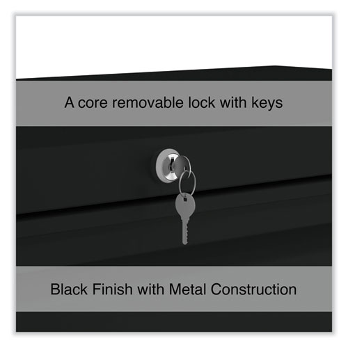 Drawers with side-to-side hang rails to accommodate letter/legal hanging files. Full drawer extension on steel ball bearing telescoping slide suspension helps drawers glide with ease. Stylish, full-width radius edge recessed pulls help to quickly open and close drawers. Anti-tipping interlock system allows only one drawer to open at a time. Single key core removable lock with two keys. Four adjustable leveling glides. Durable powder coated finish helps prevent scratches.