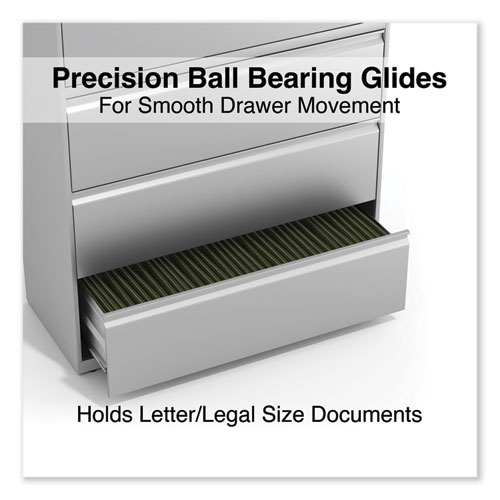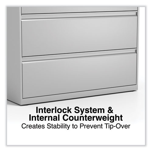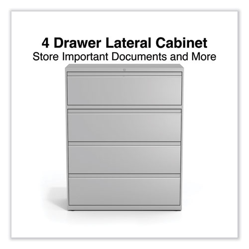 Product Details** Global Product Type Lateral File Cabinets Number of Drawers 4 Drawer Configuration File Anti-Tip Mechanism Indicator Yes Color Family Gray Pedestal Sub-Type Indicator No Caster Indicator No Anti-Tip Mechanism Counterweight,Interlocking Drawers Color(s) Light Gray Overall Width 42″ Overall Depth 18.63″ Overall Height 52.5″ Base Material Steel Top Material Steel Glide/Feet Indicator Yes Glide/Feet Details Four Adjustable-Leveling Glides Document Size Accommodation Legal,Letter Drawer Width-File Drawer 39″ Drawer Depth-File Drawer 16.5″ Drawer Height-File Drawer 12.38″ Series Name Alera® Lateral Series Product Biodegradability Indicator N Product Biodegradability in Days 0 Product Compostability Indicator N Compliance Standards Meets or Exceeds ANSI/BIFMA Standards Pre-Consumer Recycled Content Percent 12% Post-Consumer Recycled Content Percent 23% Total Recycled Content Percent 35% Special Features Four Drawers Country Of Origin US Carton Weight 196 lbs. Carton Pack Quantity 1 EA Pack Quantity 0 UPC 042167001278 UNSPSC 56101702 Shipping Weight & Item Dimensions Weight 196 lbs. Length 44.5 in Height 54.75 in Width 21.125 in Warranty Manufacturer’s limited five-year warranty.
