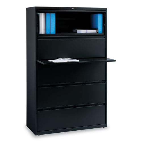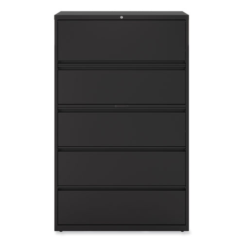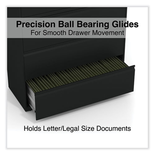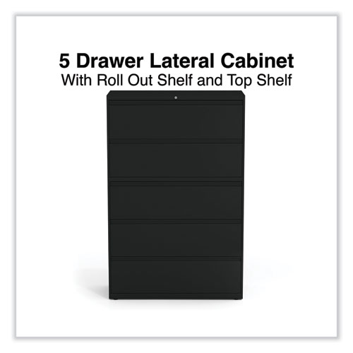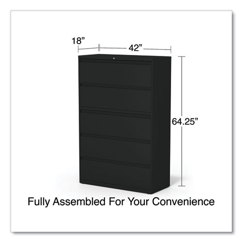 Product Details** Global Product Type Lateral File Cabinets Number of Drawers 5 Drawer Configuration File Anti-Tip Mechanism Indicator Yes Color Family Black Pedestal Sub-Type Indicator No Caster Indicator No Anti-Tip Mechanism Counterweight,Interlocking Drawers Color(s) Black Overall Width 42″ Overall Depth 18.63″ Overall Height 67.63″ Base Material Metal Top Material Metal Glide/Feet Indicator Yes Glide/Feet Details Four Fixed-Height Glides Document Size Accommodation Legal,Letter,A4,A5 Series Name Alera® Lateral Series Product Biodegradability Indicator N Product Biodegradability in Days 0 Product Compostability Indicator N Compliance Standards Level 2 Certified,Meets or Exceeds ANSI/BIFMA Standards,Meets or Exceeds ISTA Performance Standards,SCS Indoor Advantage Certified,SCS Indoor Advantage Gold Certified Pre-Consumer Recycled Content Percent 12% Post-Consumer Recycled Content Percent 24% Total Recycled Content Percent 36% Special Features Five Drawers Country Of Origin US Carton Weight 230 lbs. Carton Pack Quantity 1 EA Pack Quantity 0 UPC 042167001292 UNSPSC 44111515 Shipping Weight & Item Dimensions Weight 230 lbs. Length 44.5 in Height 69.875 in Width 21.125 in Warranty Manufacturer’s limited five-year warranty.