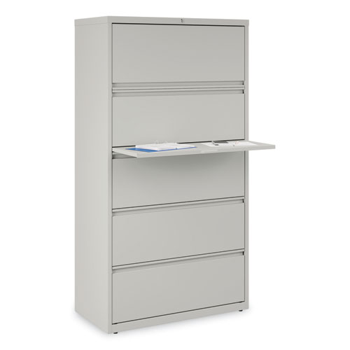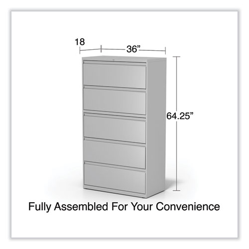 Product Details** Global Product Type Lateral File Cabinets Number of Drawers 5 Drawer Configuration File Anti-Tip Mechanism Indicator Yes Color Family Gray Pedestal Sub-Type Indicator No Caster Indicator No Anti-Tip Mechanism Counterweight,Interlocking Drawers Color(s) Light Gray Overall Width 36″ Overall Depth 18.63″ Overall Height 67.63″ Base Material Metal Top Material Metal Glide/Feet Indicator Yes Glide/Feet Details Four Fixed-Height Glides Document Size Accommodation Legal,Letter,A4,A5 Series Name Alera® Lateral Series Product Biodegradability Indicator N Product Biodegradability in Days 0 Product Compostability Indicator N Compliance Standards Level 2 Certified,Meets or Exceeds ANSI/BIFMA Standards,Meets or Exceeds ISTA Performance Standards,SCS Indoor Advantage Certified,SCS Indoor Advantage Gold Certified Pre-Consumer Recycled Content Percent 12% Post-Consumer Recycled Content Percent 24% Total Recycled Content Percent 36% Special Features Five Drawers Country Of Origin US Carton Weight 202 lbs. Carton Pack Quantity 1 EA Pack Quantity 0 UPC 042167001155 UNSPSC 44111515 Shipping Weight & Item Dimensions Weight 202 lbs. Length 38.5 in Height 69.875 in Width 21.125 in Warranty Manufacturer’s limited five-year warranty.