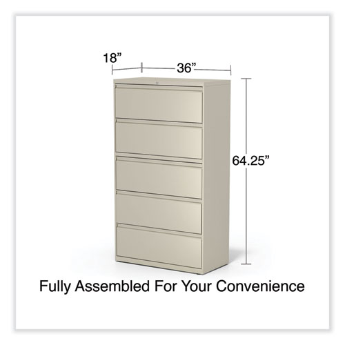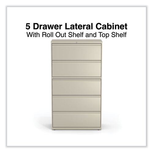 Product Details** Global Product Type Lateral File Cabinets Number of Drawers 5 Drawer Configuration File Anti-Tip Mechanism Indicator Yes Color Family Beige Pedestal Sub-Type Indicator No Caster Indicator No Anti-Tip Mechanism Counterweight,Interlocking Drawers Color(s) Putty Overall Width 36″ Overall Depth 18.63″ Overall Height 67.63″ Base Material Metal Top Material Metal Glide/Feet Indicator Yes Glide/Feet Details Four Fixed-Height Glides Document Size Accommodation Legal,Letter,A4,A5 Series Name Alera® Lateral Series Product Biodegradability Indicator N Product Biodegradability in Days 0 Product Compostability Indicator N Compliance Standards Level 2 Certified,Meets or Exceeds ANSI/BIFMA Standards,Meets or Exceeds ISTA Performance Standards,SCS Indoor Advantage Certified,SCS Indoor Advantage Gold Certified Pre-Consumer Recycled Content Percent 12% Post-Consumer Recycled Content Percent 24% Total Recycled Content Percent 36% Special Features Five Drawers Country Of Origin US Carton Weight 202 lbs. Carton Pack Quantity 1 EA Pack Quantity 0 UPC 042167001162 UNSPSC 44111515 Shipping Weight & Item Dimensions Weight 202 lbs. Length 38.5 in Height 69.875 in Width 21.125 in Warranty Manufacturer’s limited five-year warranty.