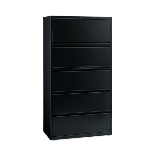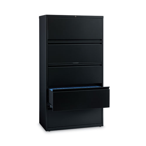 Product Details** Global Product Type Lateral File Cabinets Number of Drawers 5 Drawer Configuration File Anti-Tip Mechanism Indicator Yes Color Family Black Pedestal Sub-Type Indicator No Caster Indicator No Anti-Tip Mechanism Counterweight Color(s) Black Overall Width 36″ Overall Depth 18.62″ Overall Height 67.62″ Height Without Casters 67.62″ Base Material Steel Top Material Steel Glide/Feet Indicator Yes Glide/Feet Details Leveling Glides Document Size Accommodation Legal,Letter,A4 Weight Capacity-File Drawer 99 lb Drawer Width-File Drawer 32.37″ Drawer Depth-File Drawer 16″ Drawer Height-File Drawer 11.25″ Door Quantity 0 Series Name HL10000 Product Biodegradability Indicator N Product Biodegradability in Days 0 Product Compostability Indicator N Compliance Standards GREENGUARD Gold Certified,Meets or Exceeds ANSI/BIFMA Standards,TAA Compliant Pre-Consumer Recycled Content Percent 12% Post-Consumer Recycled Content Percent 16% Total Recycled Content Percent 28% Special Features Five Drawers—Rollout shelf accomodates binders. Country Of Origin US Carton Weight 202 lbs. Carton Pack Quantity 1 EA Pack Quantity 0 UPC 029404149924 UNSPSC 56101702 Shipping Weight & Item Dimensions Weight 202 lbs. Length 69.875 in Height 21.125 in Width 38.5 in Warranty Manufacturer’s limited lifetime wrranty.