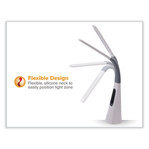 Cool off with this neat LED desk lamp with a bladeless fan! It offers stunning light and quality cooling all operated by touch power controls. Quiet yet powerful. The fan has various levels of cooling while the light itself has multiple brightness levels via the dimmer function. This gray and white lamp is bold as it is a unique shape, but is perfect for any space that needs extra brightness nonetheless. Place it on your desk at the office for reliable, crystal clear light. Its light zone is flicker-free and avoids shadows, halos and glares. Adjust the position of light using the flexible neck.