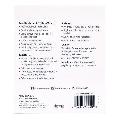 ZEISS pre-moistened lens wipes provide a gentle, thorough cleaning, removing fingerprints, dust, and smudges without scratching or streaks. Individually wrapped and disposable lens cleaning wipes can be conveniently stored anywhere, so you can safely clean your glasses while you’re on-the-go. ZEISS Lens Wipes easily remove smudges and dirt leaving your glasses as clean as the first day you got them.