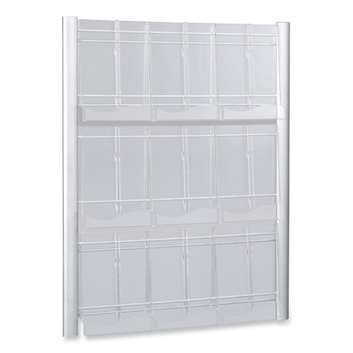 Sleek designed display with silver-coated, brushed aluminum frame and clear acrylic pockets. Wall-mounted and floor-standing racks have center dividers that allow for pockets to be sized for magazines or pamphlets.