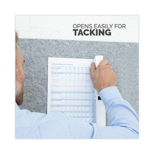 • Easily opens for tacking materials to bulletin boards without the hassle of pressing a lever or hidden button; anvil rotates for temporary pinning documents.
