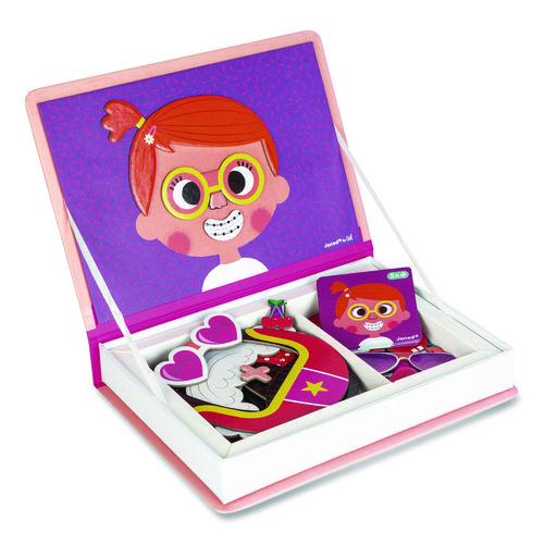 Cardboard magnetic educational game based on a theme; composed of many magnets and cards. Once the book is opened, the object of the game is to use the magnetic background for the placement of magnets to recreate the scene indicated on the card. Children can also have fun mixing the various interchangeable pieces to create their own stories. Educational learning aid, enhancing cognition and dexterity.