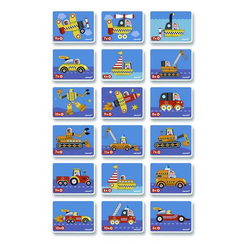 Cardboard magnetic educational game based on a theme; composed of many magnets and cards. Once the book is opened, the object of the game is to use the magnetic background for the placement of magnets to recreate the scene indicated on the card. Children can also have fun mixing the various interchangeable pieces to create their own stories. Educational learning aid, enhancing cognition and dexterity.