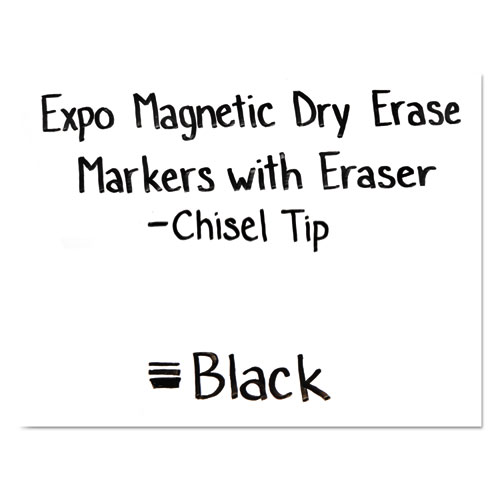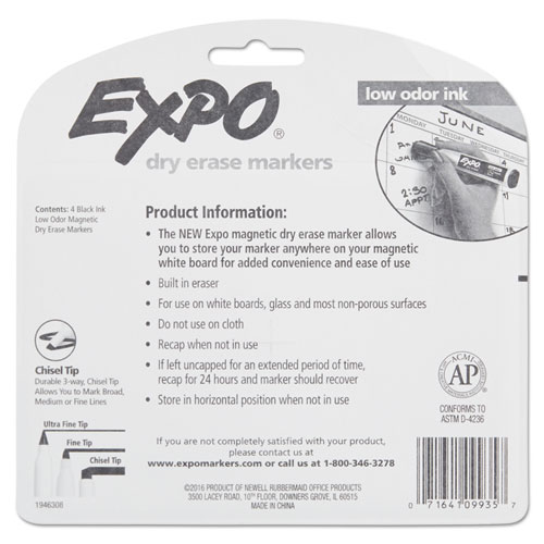 Product Details** Global Product Type Dry Erase Markers Marker Ink Type Dry Erase Marker Grade General Use Marker Tip Type Chisel Color Family Black Marker Tip Size (text) Broad Marker Color(s) Black Product Biodegradability Indicator N Product Biodegradability in Days 0 Product Compostability Indicator N Pre-Consumer Recycled Content Percent 0% Post-Consumer Recycled Content Percent 0% Total Recycled Content Percent 0% Special Features Versatile Chisel Tip-Fine, chisel tip draws bold details and allows users to draw 3 line widths. Country Of Origin CN Carton Weight 6 lbs. Carton Pack Quantity 36 PK Pack Quantity 4 EA UPC 071641099357 UNSPSC 44121708 Shipping Weight & Item Dimensions Weight 0.1 lbs. Length 5.94 in Height 0.91 in Width 5.88 in