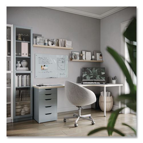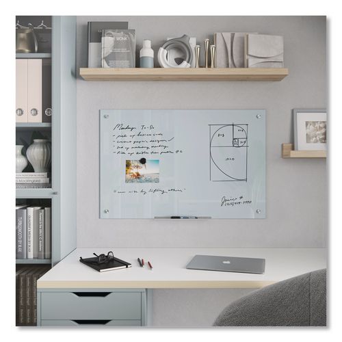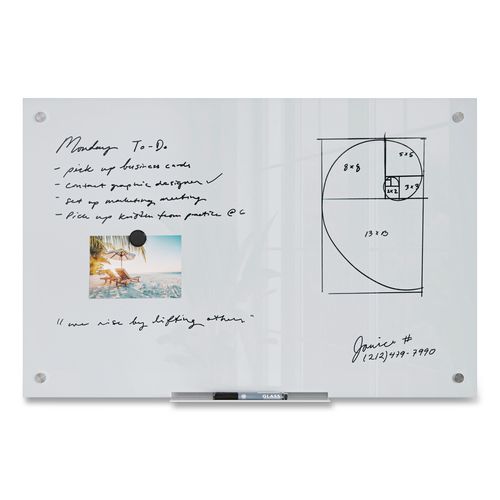 Frosted white, magnetic glass dry erase board is the perfect, functional solution for frequent and heavy-use areas in offices, classrooms and commercial spaces. Its clean, contemporary lines add a touch of style to your space, too. Modern, frameless design enables you to hang multiple glass boards adjacent to one another to expand your writing surface to fit your needs. Continuously outperforming all melamine and painted steel alternatives, this board’s premium, stain- and ghost-proof tempered glass magnetic writing surface erases easily with a simple board eraser (one U Brands Microfiber Board Eraser included). After heavy, continuous use, simply use any dry-erase wet wipe or spray to make the surface look new again (sprays and wipes sold separately). Ferrous magnetic surface accommodates high-energy rare earth magnets (one U Brands High-Energy Rare Earth Magnet included). And though all dry erase and glass-board markers are compatible with the board’s surface, U Brands Liquid Glass Markers provide the ultimate writing and erasability experience (six U Brands Liquid Glass Markers included). Universal mounting system allows the board to be hung vertically or horizontally, and all wall hanging hardware is hidden under the mounting bolts to provide a sleek, modern appearance. Packaged with extra supportive corrugate material for added safety during shipping and handling (corrugated material is recyclable).