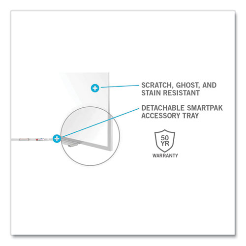 Providing long-lasting performance and durability, Ghent’s Porcelain Magnetic Whiteboards are made with customers in mind. The porcelain-on-steel surface is mounted to a solid backing for added strength that stands up to the rigors of the most high-use classrooms and offices. The durable scratch- and dent-resistant porcelain-enameled surface also ensures that your dry erase board never absorbs ink, eliminating the possibility of staining and ghosting. Easy-wipe surface requires less cleaning, too, so you can achieve a long-lasting bright white surface without the hassle. Use the magnetic surface to post flyers, bulletins, teaching accessories and more. Each board features a sleek satin aluminum frame with a matching cork-strip map rail and accessory tray.