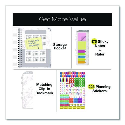 Product Details** Global Product Type Appointment Book/Personal Organizers Dated Yes Academic Year No Calendar Format Weekly/Monthly Edition Year 2024 to 2025 Calendar Term 14-Month (Nov to Dec) Binding Type Wire-O Color Family White Refillable No Calendar Spread Format One Week per Two-Page Spread,One Month per Two-Page Spread Julian Dates No Size (Bound-Side First) 11 x 8.5 Binding Details Twin-Wire: Hard Cover Cover Theme Marble Stone Artwork Cover Color(s) White/Gray/Silver Cover Material(s) Heavyweight Paperboard Binding Color(s) Silver Corner Color(s) Silver Appointment Ruling Open Scheduling Calendar Reference Blocks Weekly: One Past Month,Monthly: One Past Month, One Future Month Separate Sections (11) Ruled Notes Pages Sheet Color(s) White/Turquoise Pocket Details (1) Interior Storage Pocket Reversible No Product Biodegradability Indicator N Product Biodegradability in Days 0 Product Compostability Indicator N Package Includes (223) Multicolor Planning Stickers,(5) Pads of Self-Stick Page Flag Arrows,(2) Pads of 3″ x 3″ Self-Stick Notes,(1) Marble-Pattern Clip-In Bookmark,(1) 7″ Ruler Pre-Consumer Recycled Content Percent 0% Post-Consumer Recycled Content Percent 0% Total Recycled Content Percent 0% Country Of Origin CN Carton Weight 42 lbs. Carton Pack Quantity 28 EA Pack Quantity 0 UPC 840312310134 UNSPSC 44112004 Shipping Weight & Item Dimensions Weight 1.47 lbs. Length 11.135 in Height 0.803 in Width 9.018 in