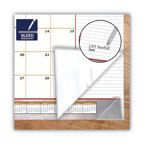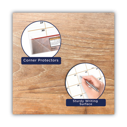 This upscale monthly desk pad covers a full year and has a burgundy marbled design on every page, letting you plan your schedule in style. Pages are printed with a burgundy marble design that will add a touch of modern style to your day. Desk pad covers a 12-month date range January December. High-quality paper features superior ink bleed resistance. One month per page format has ruled daily blocks, a column for notes and full year of reference calendar blocks. Special features include a durable backboard for sturdy writing, bonus pages for notes, phone numbers, and important dates, and four clear corner protectors. Pages measure 21.75″ x 17″.
