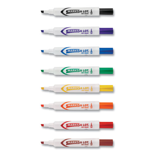 Product Details** Global Product Type Dry Erase Markers Marker Ink Type Dry Erase Marker Grade General Use Marker Tip Type Chisel Color Family Multicolor Marker Tip Size (text) Broad Marker Tip Size (numeric) 4.8 mm Marker Color(s) Assorted Marker Color Assortment Black,Blue,Brown,Green,Orange,Purple,Red,Yellow Marker Series MARKS A LOT Product Biodegradability Indicator N Product Biodegradability in Days 0 Product Compostability Indicator N Compliance Standards ACMI AP Non-Toxic Certified,Conforms to ASTM D4236 Standards Pre-Consumer Recycled Content Percent 0% Post-Consumer Recycled Content Percent 0% Total Recycled Content Percent 0% Country Of Origin MX Carton Weight 11 lbs. Carton Pack Quantity 36 ST Pack Quantity 8 EA UPC 071709244118 UNSPSC 44121708 Shipping Weight & Item Dimensions Weight 0.374 lbs. Length 7.5 in Height 1 in Width 6 in